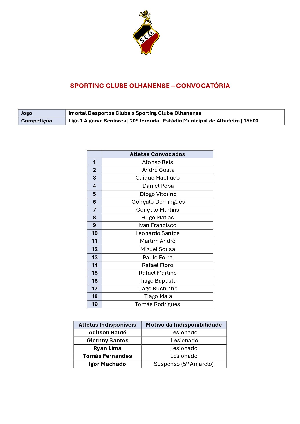 Convocatória dos Séniores – 20.ª jornada 27 de Fevereiro, 2026 Navegação de artigos Anterior Atletas do SC Olhanense distinguidos por conquista histórica