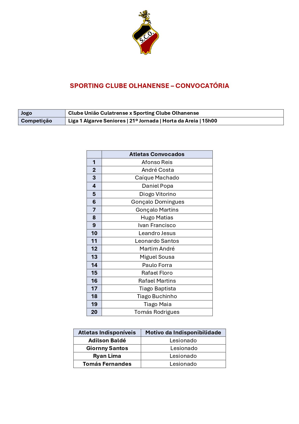 >>>> Convocatória dos Séniores – 21.ª jornada – Sporting Clube Olhanense